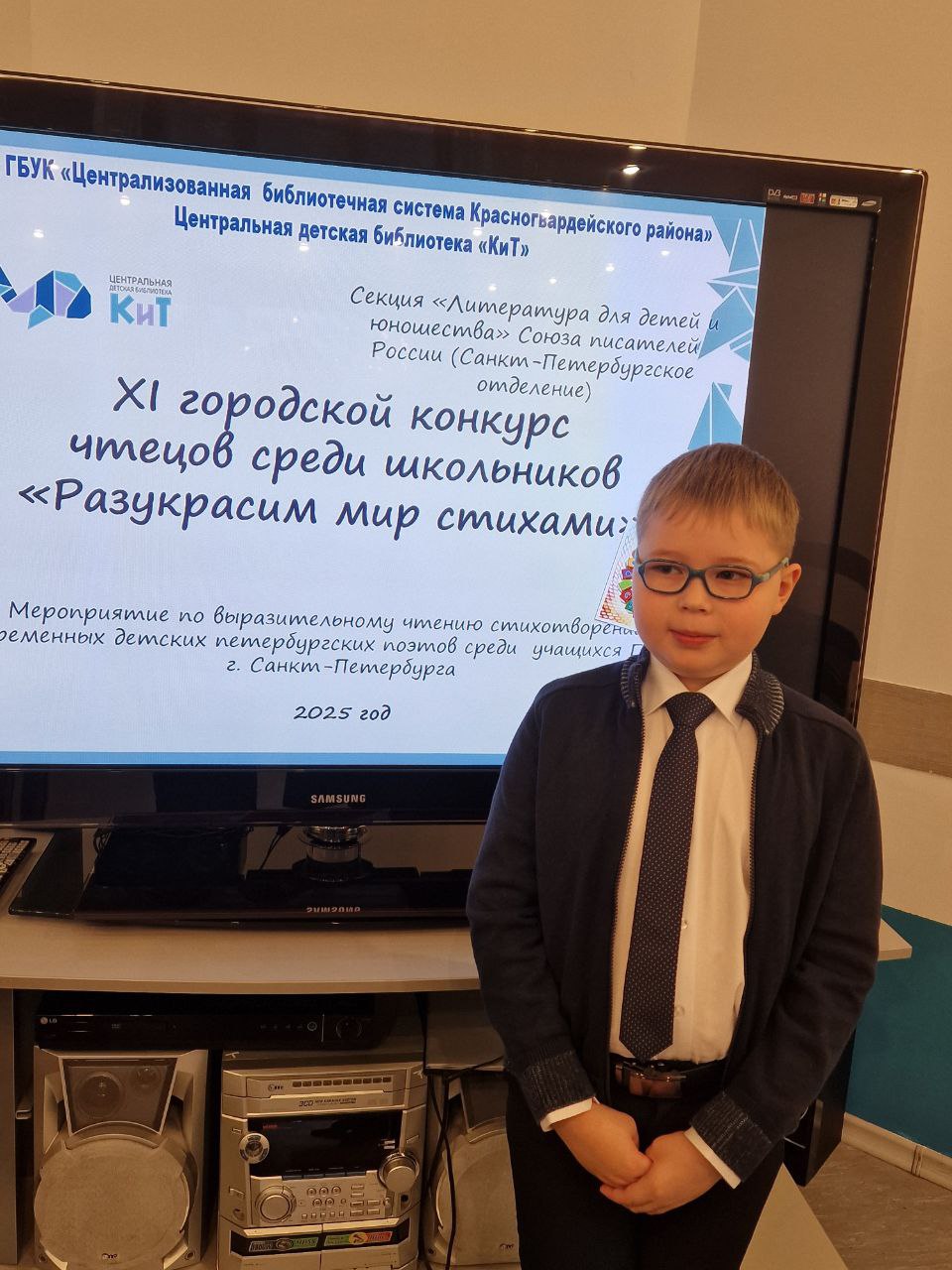 25 ноября на базе Районной детской библиотеки «КиТ» состоялся районный этап XI городского конкурса чтецов среди школьников «Разукрасим мир стихами» — мероприятие по выразительному чтению стихотворений современных детских петербургских поэтов среди учащихся школ Красногвардейского района.